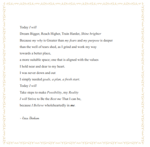 Inside Message: Today I WILL: Dream Bigger, Reach Higher, Train Harder, Shine Brighter. Because MY WHY is Greater than my fears, and MY PURPOSE is deeper than the well of tears shed as I grind and work my way towards a better place, a more suitable space, one that is aligned with the values I hold near and dear to my heart. I was never down and out. I simply needed goals, a plan, a fresh start. Today I WILL: Take steps to make possibility my reality. I WILL strive to be the best that I can be, because I Believe, wholeheartedly in ME.  – Erica Denham